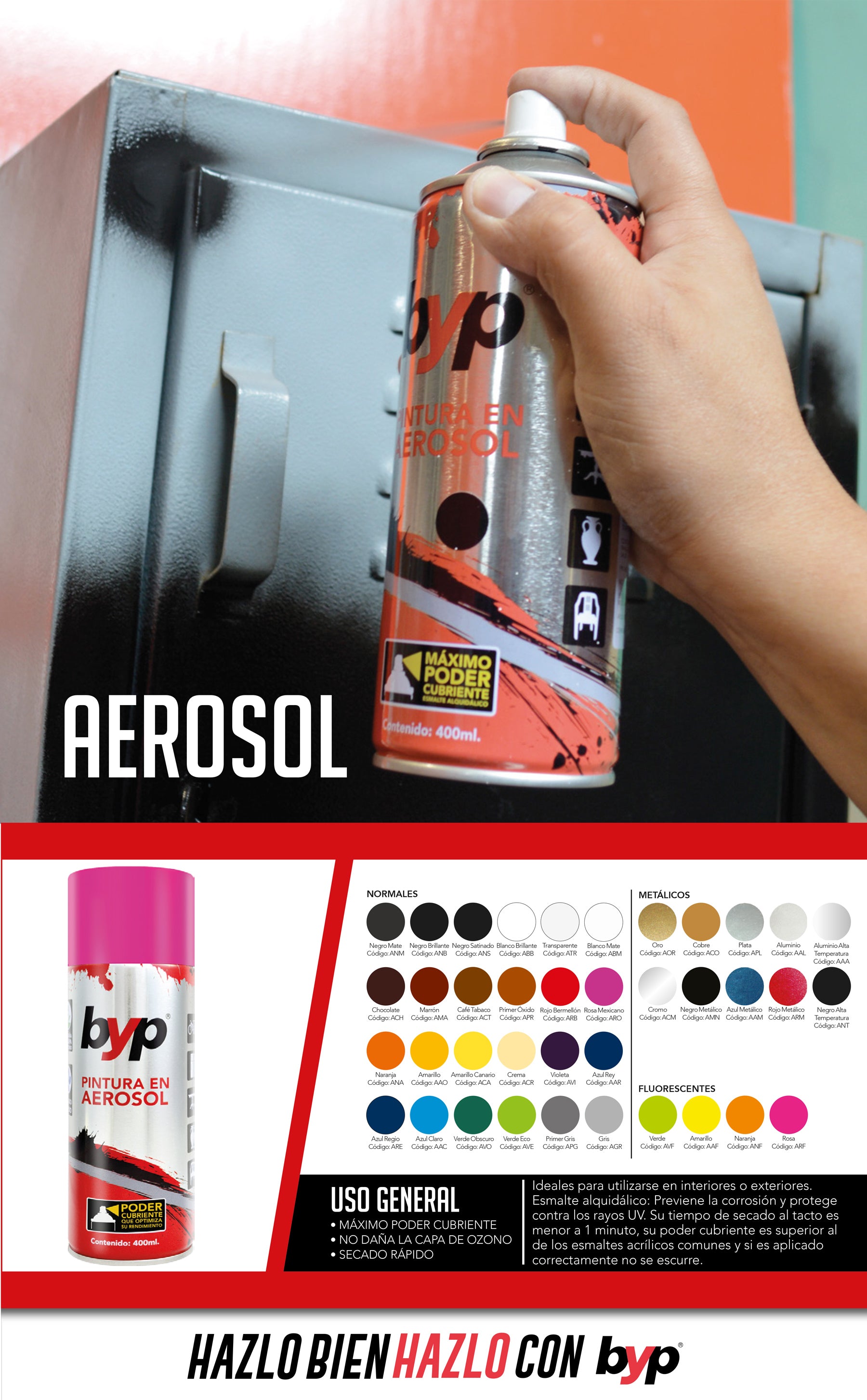 La pintura en aerosol byp cuenta con una amplia gama de colores para todo tipo de trabajo.