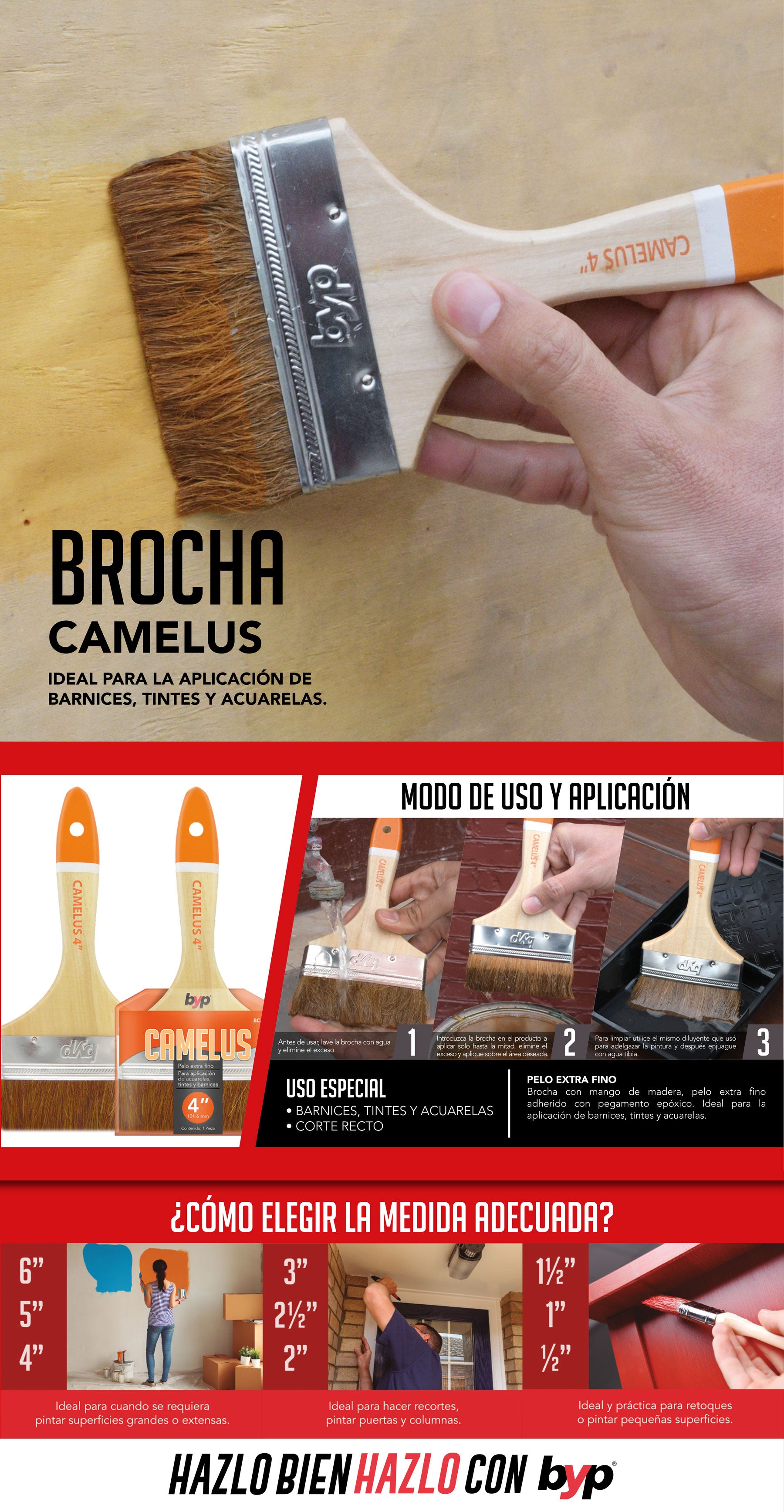 Una brocha especial, ideal para la aplicación de barnices, tintes y acuarelas. Sus cerdas ayudan a facilitar el trabajo y brindan un acabado más fino y uniforme.