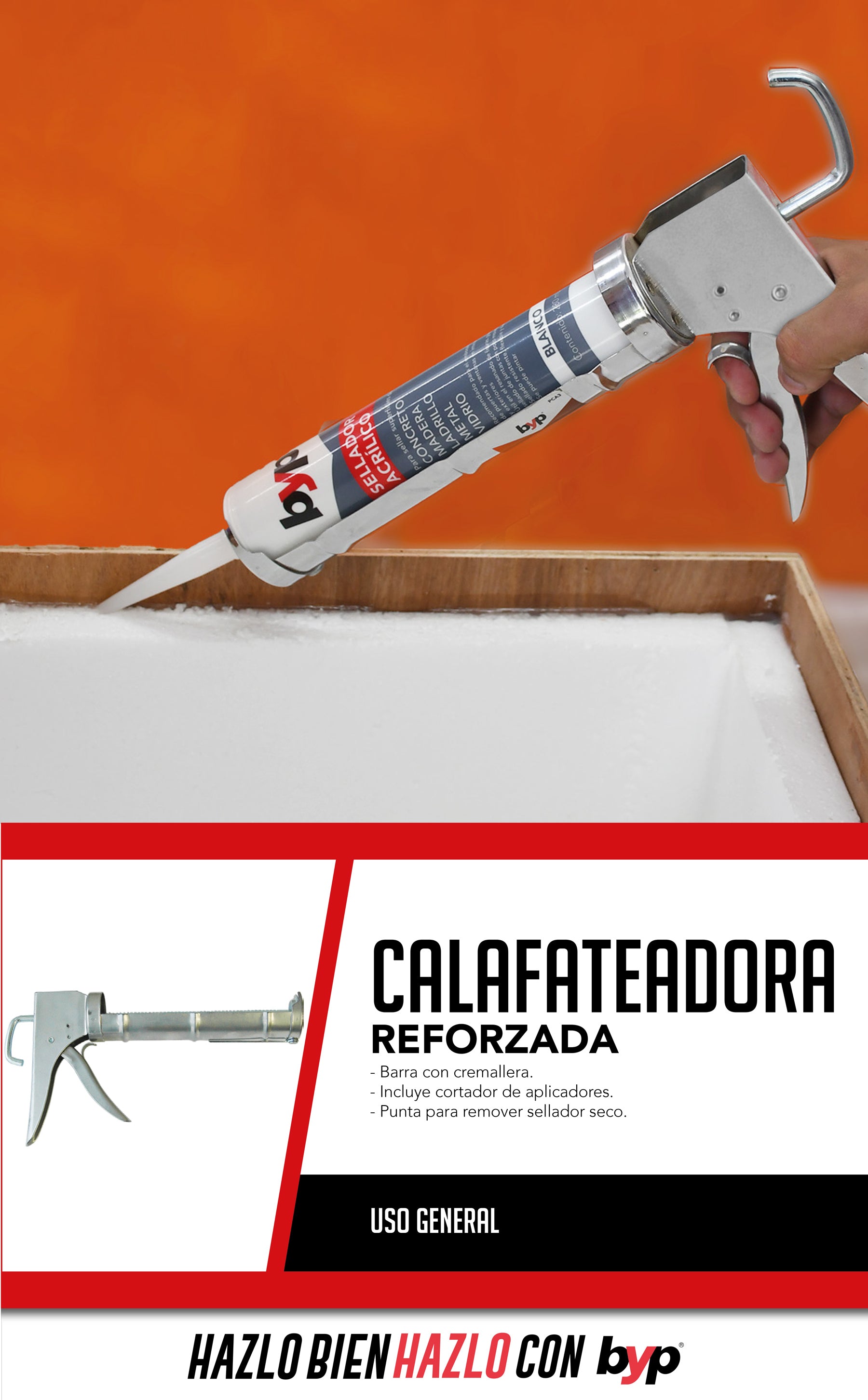 Pistola calafateadora reforzada byp recomendada para el uso de aplicaciones de selladores de silicón. Fabricada con lámina de acero, lo que la hace aún más resistente.