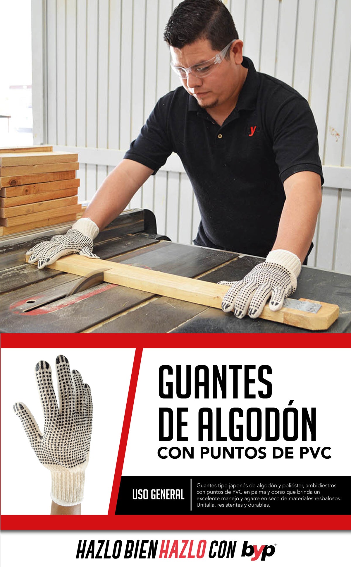 Guantes tipo japonés de algodón y poliéster, con puntos de PVC en palma y dorso que ofrece un excelente manejo y agarre en seco de materiales resbalosos. Unitalla, resistentes y duraderos. Uso general.