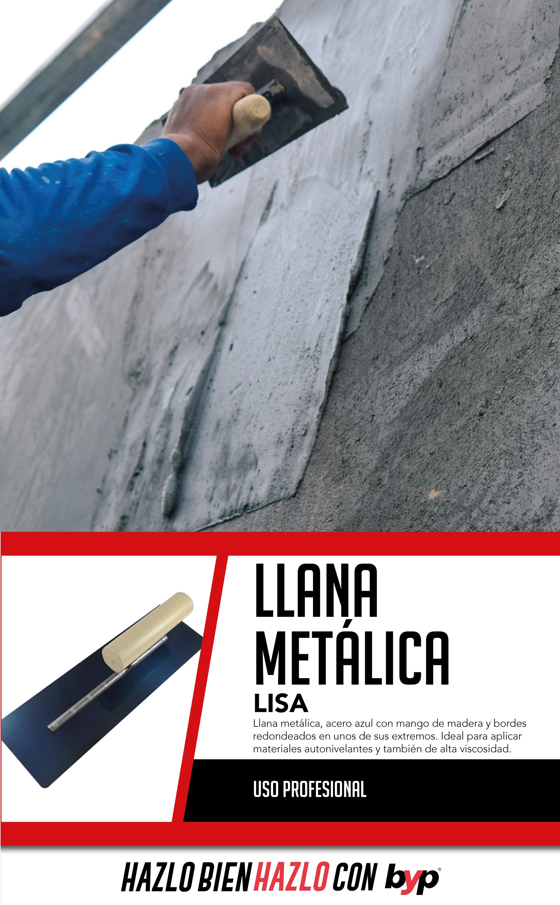 Llana metálica, acero azul con mago de madera y bordes redondeados en uno de sus extremos. Ideal para aplicar materiales autonivelantes y de alta viscosidad.