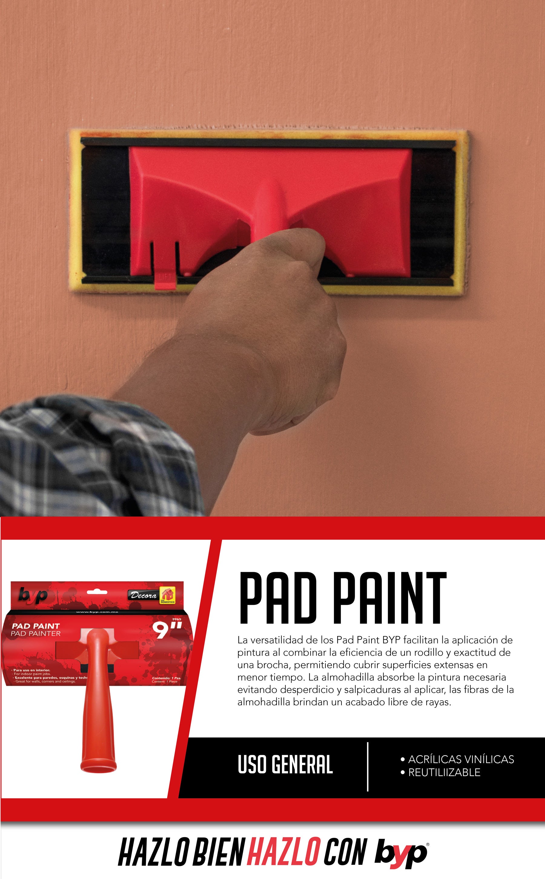 Diseño compacto y ligero, esta almohadilla facilita la aplicación de pintura al combinar la eficiencia de un rodillo y exactitud de una brocha.
