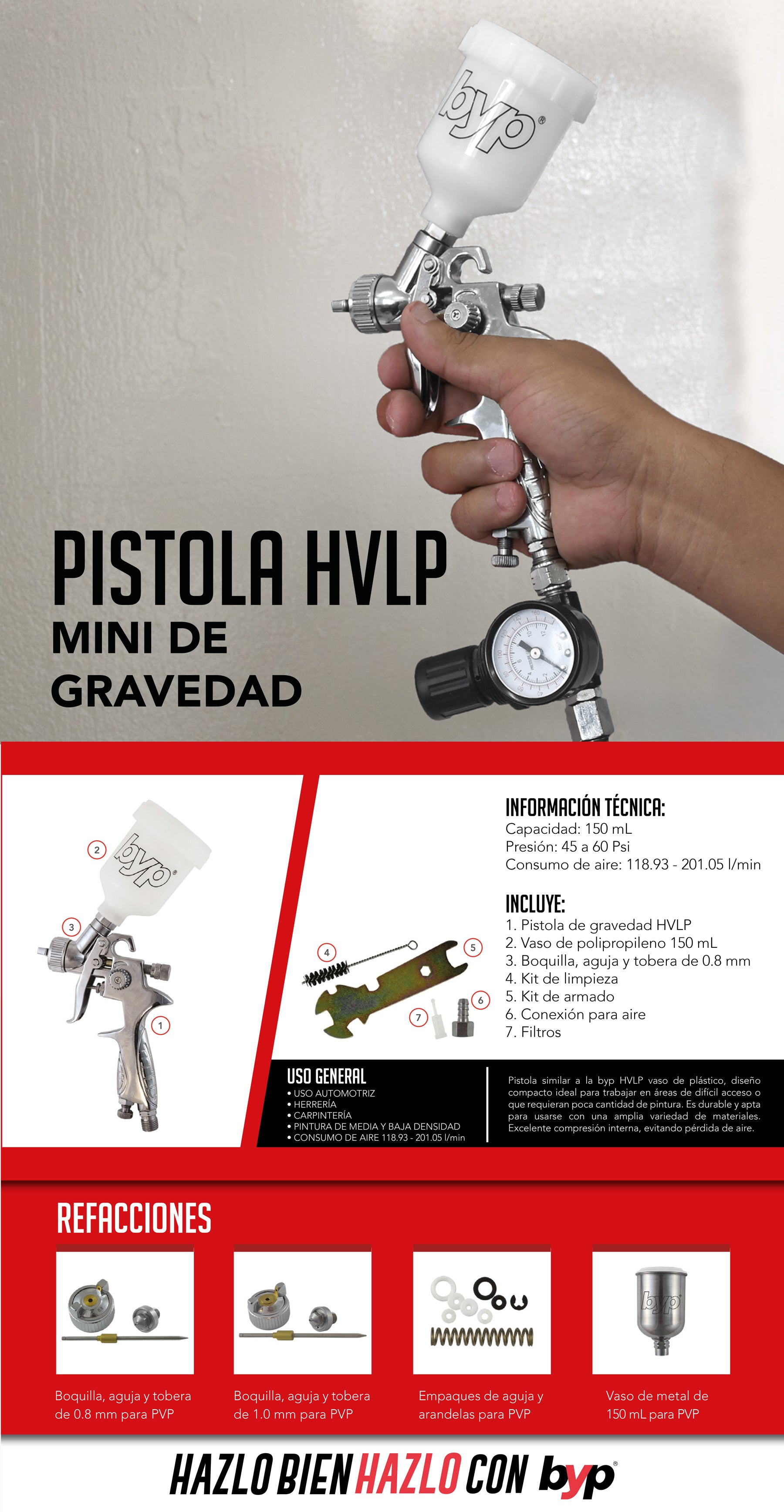 Pistola con vaso de plástico, diseño compacto ideal para trabajar en áreas de difícil acceso o que requieran poca cantidad de pintura.