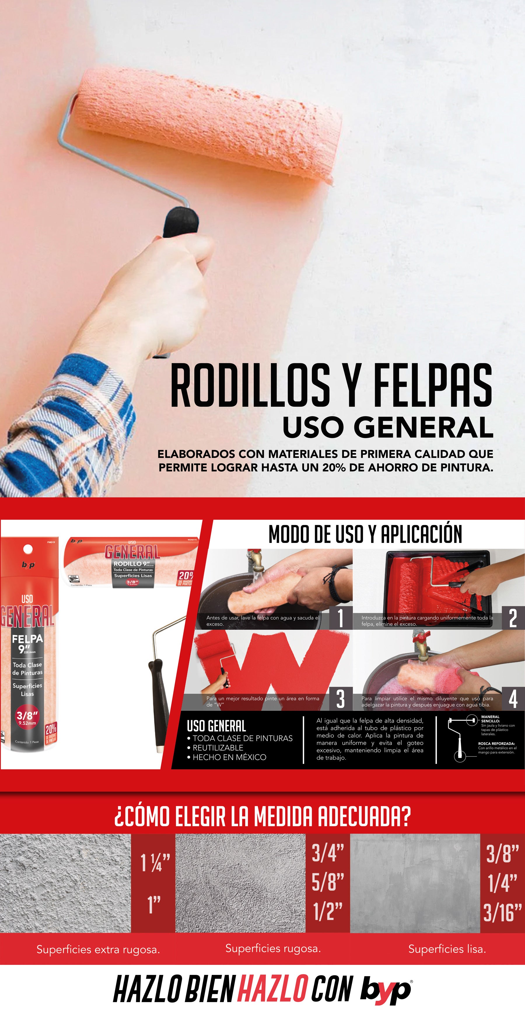 Ahorra hasta un 30% más en pintura y cubre más área en menos tiempo. Ofrece una excelente retención de pintura, evita escurrimientos y conserva limpia el área de trabajo
